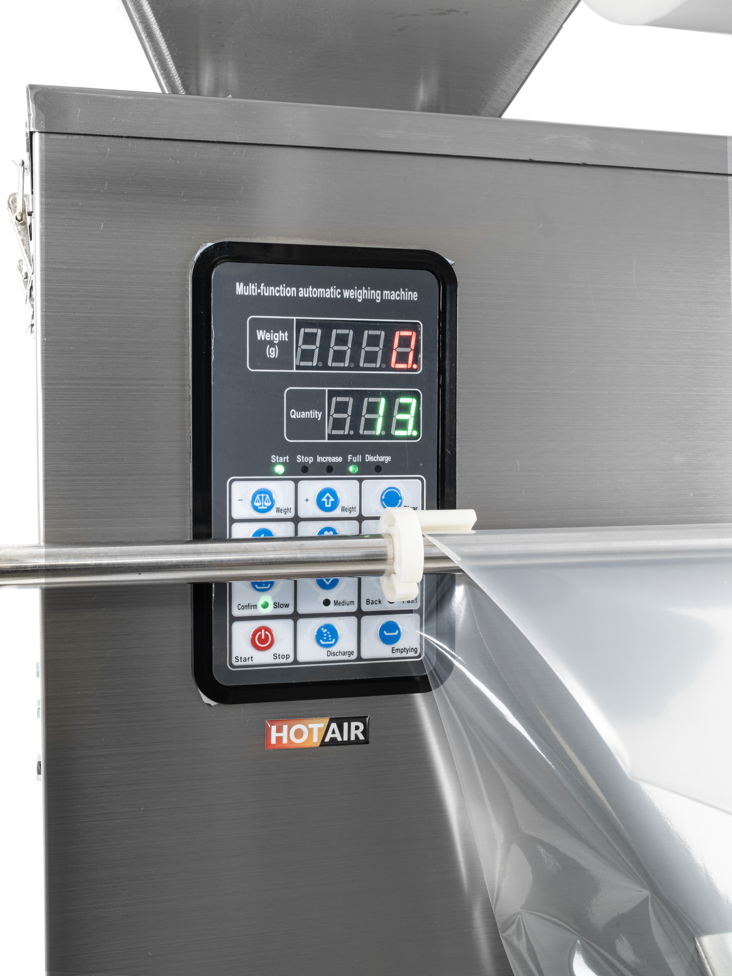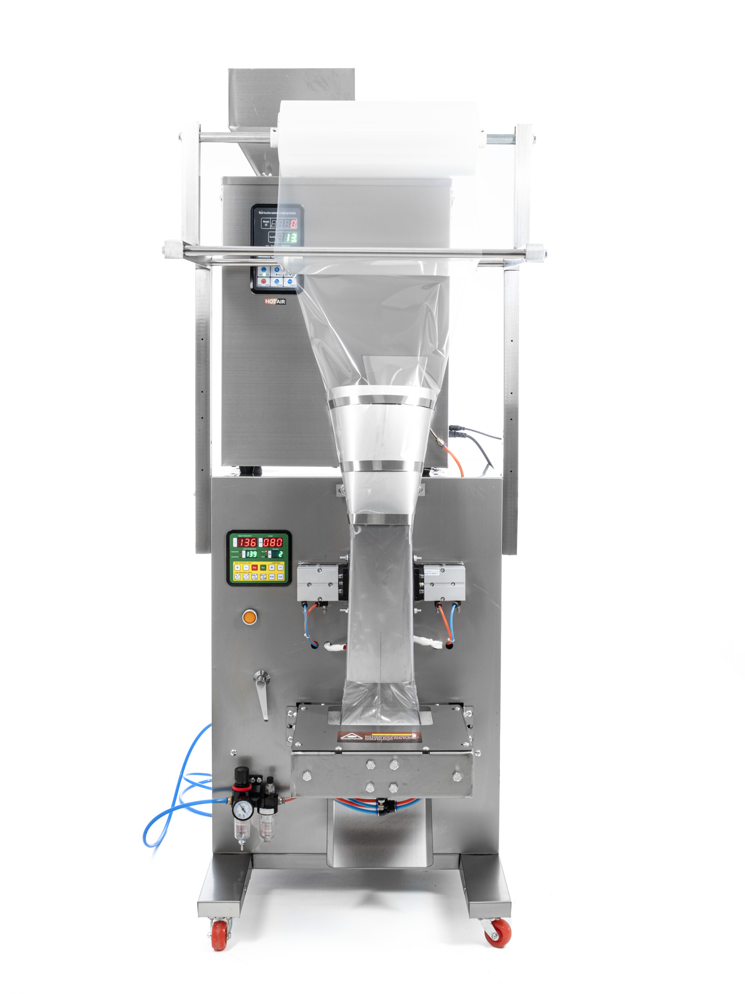 Die Steuerung der Maschine erfolgt über Drucktasten und zwei Displays, auf denen die aktuell eingestellten Werte für Chargengewicht, Sacklänge und Schweißtemperatur übersichtlich angezeigt werden. Die Einstellung der Betriebsparameter ist schnell und intuitiv, ohne dass eine komplexe Konfiguration erforderlich ist. Die Maschine ermöglicht die Verwendung von individuell schweißbaren, bedruckten Folien, was eine geeignete Lösung für Hersteller ist, die ihre Marke direkt auf der Produktverpackung präsentieren möchten. Die Verpackungsmaschine ist mit feststellbaren Rollen ausgestattet, die es ermöglichen, die Maschine leicht zu bewegen und stabil am Arbeitsplatz zu positionieren.
