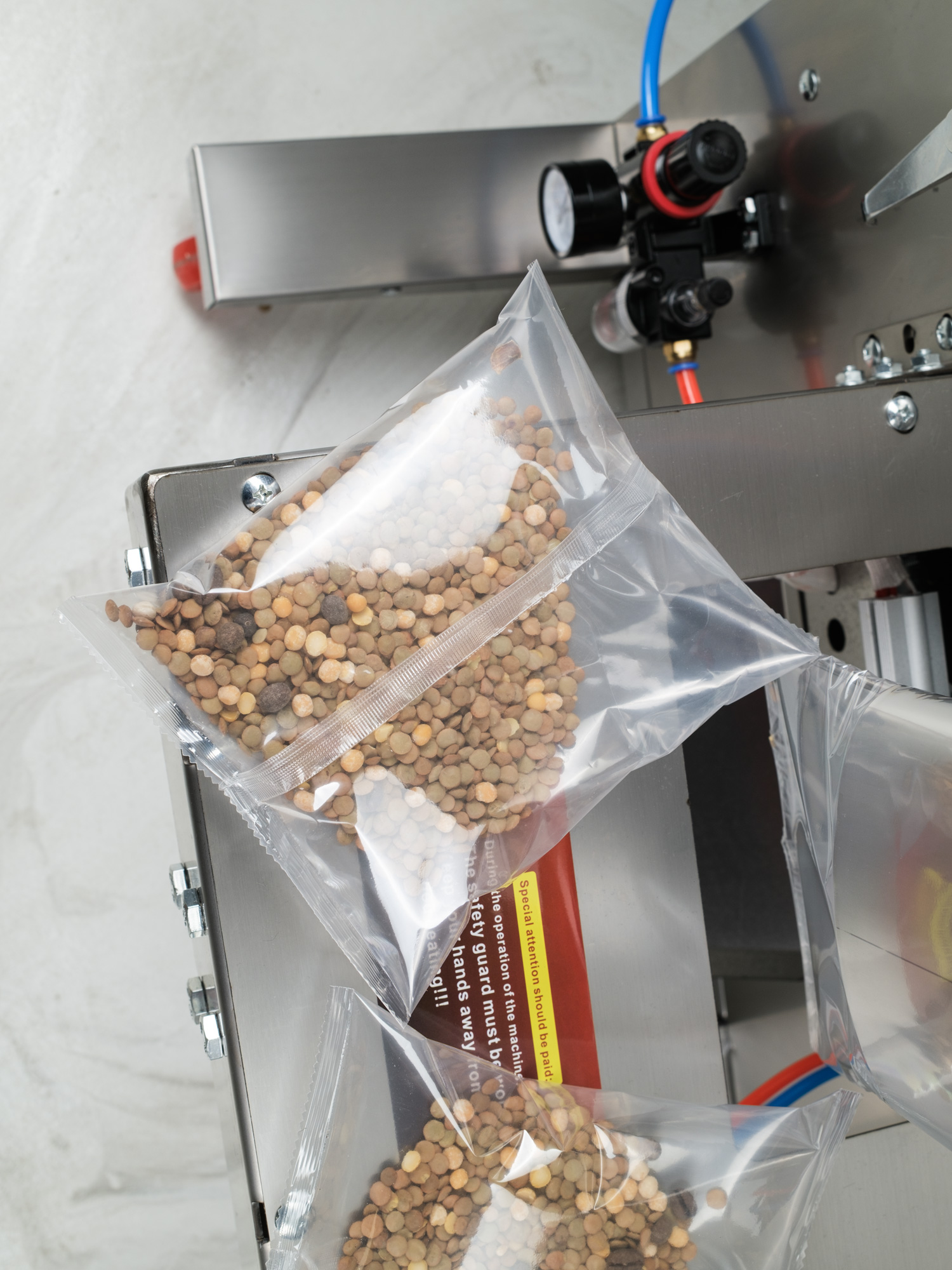Die automatische vertikale Verpackungsmaschine mit Schüttgutspender und Schutzatmosphärenverpackung (MAP) ist für die präzise Dosierung und Verpackung von Schüttgut und körnigen Produkten in schweißbare Folien unter Schutzgas konzipiert. In einem kontinuierlichen Arbeitszyklus sorgt sie für die Materialdosierung, die Verpackungsbildung, die Befüllung mit Schutzatmosphäre und deren hermetischen Verschluss.