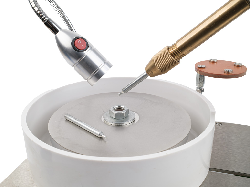 Erleichtert wird die Arbeit auch durch die integrierte LED-Beleuchtung, die eine bessere Sichtbarkeit von Details und eine präzise Kontrolle der geschliffenen Flächen gewährleistet. Die Kombination aus Drehzahlregelung, präziser Winkeleinstellung und fortschrittlicher Indexierung über den DOP-Halter macht dieses Gerät zu einem vielseitigen Werkzeug für die komplette Steinbearbeitung - von der grundlegenden Formgebung bis hin zum abschließenden Polieren mit einem hohen Maß an Präzision.