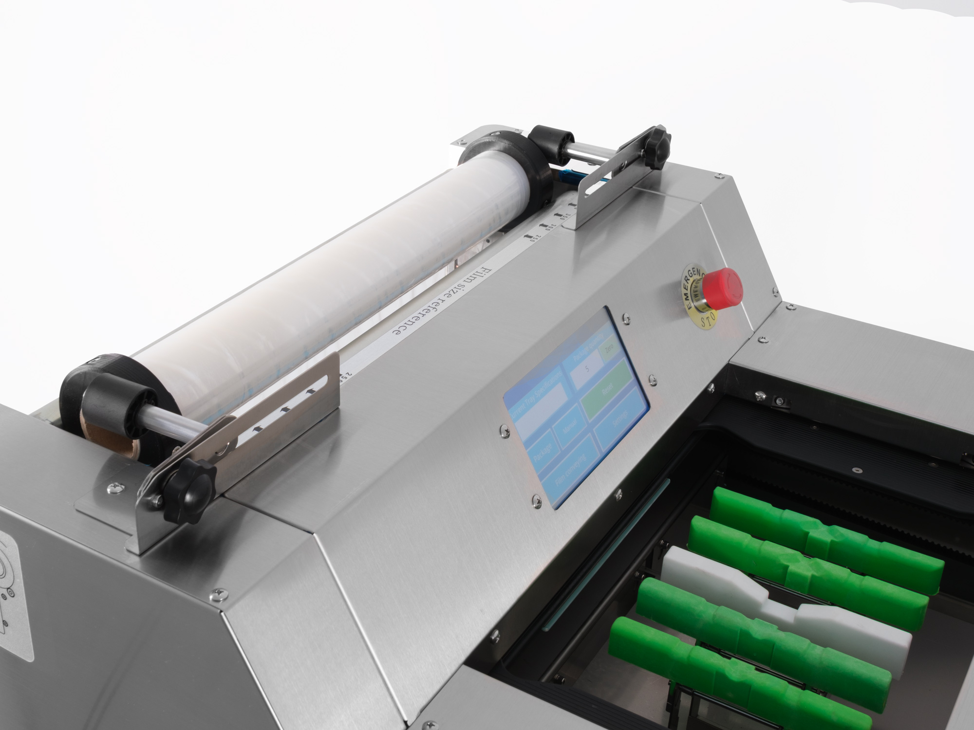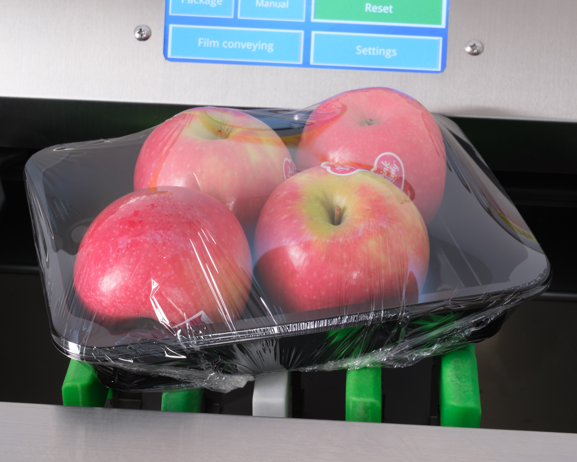 Die Maschine arbeitet mit handelsüblicher Lebensmittel-Stretchfolie von 250-450 mm Breite. Sie kann Schalen verschiedener Materialien und Formen (rechteckig, quadratisch, rund) verpacken, aber auch Produkte ohne Schale - zum Beispiel Salat oder Gemüsebündel - verarbeiten. Die maximale Größe des verpackten Produkts (einschließlich der Schale) beträgt 280 × 150 × 200 mm. Nachdem die Folie um die Schale gewickelt wurde, wird die Unterseite der Schale einfach versiegelt, indem sie auf die integrierte Heizfläche gelegt wird, wodurch die Folie auf der Unterseite versiegelt wird. Das Ergebnis ist eine saubere, stabile Verpackung, die sich für den Direktverkauf oder den Transport eignet.