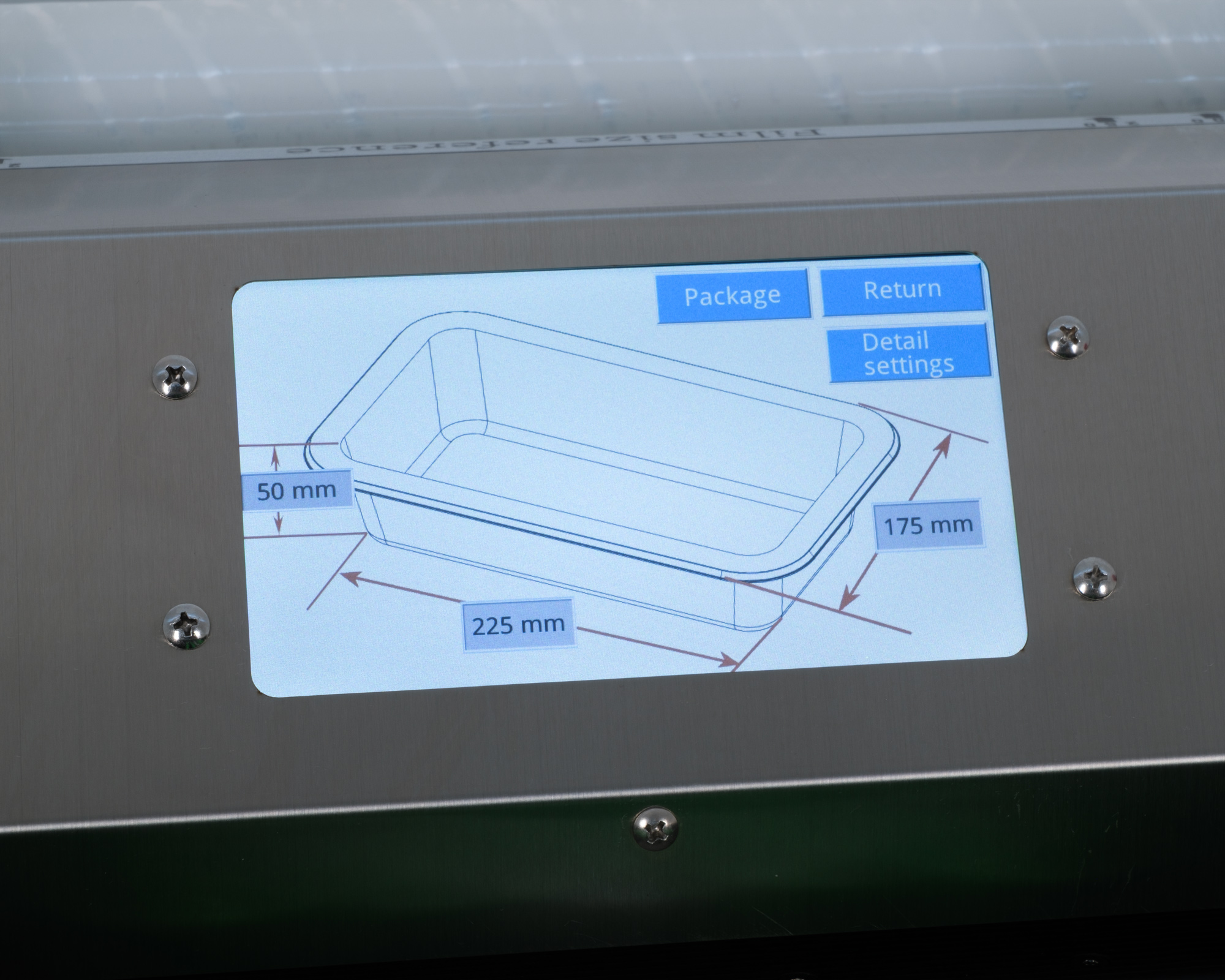 Die Bedienung der Maschine ist so intuitiv wie möglich. Über den Touchscreen kann der Benutzer die Parameter entsprechend der Größe und Form der Schale einstellen oder die Spannkraft der Folie anpassen. Der Verpackungsvorgang kann manuell oder vollautomatisch gestartet werden - die Maschine selbst erkennt das eingelegte Produkt und startet den Verpackungszyklus. Die Verpackungsmaschine bietet die Möglichkeit, bis zu 50 verschiedene Schalentypen zu speichern und zu benennen, so dass nicht jedes Mal, wenn sich die Schalen-/Produktgröße ändert, die Abmessungen und Parameter manuell neu eingestellt werden müssen.