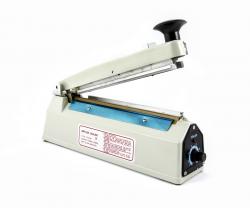 Manuelles Impulsklammer-Folienschweißgerät mit maximaler Schweißlänge 20cm FKR-200A zum beidseitigen Schweißen von Folien mit Metallschicht, insbesondere Lebensmittelfolien, Zellophanfolien, fertige LDPE-Beutel, Säcke, es kann auch für andere Materialien verwendet werden - PVC, PP, PA. Geeignet auch für Beutel mit Seitenaufbewahrung zur Aufbewahrung von geröstetem Kaffee oder losem Tee. Der Impulsfolienroller FKR-200A besteht aus zwei Teilen - einer Schweißzange und einem Transformator. Dank der Trennung des Transformators von der Zange ist die Zange mit nur 970 Gramm angenehm leicht und lässt sich gut handhaben. Außerdem ist das Kabel lang genug (220 cm+), so dass man mit ihr überall hinkommt. Neben einem Schalter verfügt der Transformator auch über einen Zeitregler, bei dem die Schweißlänge von 1 - 8 eingestellt werden kann. Die Zeit muss der Dicke und dem Material der zu schweißenden Folien entsprechen. Am Zeitregler befindet sich auch eine Anzeigediode, die den Schweißvorgang anzeigt. Die Backen der Zange selbst sind 20 cm lang und mit 5 mm breiten Heizwiderstandsdrähten versehen, die unter hitzebeständigem Teflonband verborgen sind, um zu verhindern, dass die Folie mit dem Schmelzdraht verschmilzt. Die Schweißung erfolgt nur durch Zusammendrücken des Griffs (Klemmen). Die resultierende Schweißnaht ist 5,5 mm breit . Das beidseitige Schweißen führt zu einer wirklich luft- und wasserdichten, unzerbrechlichen Schweißnaht, die nur durch Abscheren oder mit roher Gewalt geöffnet werden kann. Dieses Schweißgerät ist eines der wenigen, das in der Lage ist, neben den klassischen 0-förmigen Tunneln (Sleeves) auch andere Folienformen zu verschweißen - zum Beispiel einen Tunnel mit gefalteten Seiten (X-förmig) - die meisten Lebensmittelverpackungen haben diese Art von Schweißnaht. Sie eignet sich zum Beispiel sehr gut zum Verschweißen von Kaffee- oder Teebeuteln. Dank der Schweißnahtdicke von 5,5 mm besteht keine Gefahr des Auslaufens von Aromen oder des Benetzens. Dank seiner stabilen Füße kann das Handschweißgerät auch als Tischschweißgerät verwendet werden. Das Schweißgerät hat gummierte Griffe, damit es Ihnen bei der Handhabung nicht aus den Händen rutscht. Das Schweißgerät ist ideal für das Verpacken von schweren und größeren Produkten (z.B. Säcke), die aufgrund ihrer Größe und ihres Gewichts nicht in ein herkömmliches Tischschweißgerät gelegt werden können. Der perfekte Helfer für jedes Lager. Dank der großen Dicke der Schweißnaht sieht die verschlossene Produktverpackung immer wie das Original aus, das gerade die Produktion verlassen hat. Wir bieten diese Handklemm-Impulsschweißgeräte in drei Varianten an - in 40cm, 30cm und 20cm Länge. Wir bieten auch Schweißgeräte in der gleichen Ausführung mit einer anderen Schweißtechnologie an - anstelle von Schmelzdrähten, die durch einen Impuls schweißen, haben sie kontinuierlich beheizte Backen durch ein Heizelement. Diese Schweißgeräte haben dann keine Basisstation und sind etwas schwerer. Siehe Produktvarianten. Die Länge des Schweißgeräts sollte entsprechend der Breite der am häufigsten geschweißten Kunststoffe gewählt werden, um eine Überhitzung des Schmelzdrahtes durch übermäßige Erwärmung in Bereichen, in denen nicht geschweißt wird, zu vermeiden. Dadurch wird die Lebensdauer der Schweißfäden verlängert. Zusammen mit dem Schweißgerät empfehlen wir auch den Kauf von 1 Stück hitzebeständigem Band unter dem Heizdraht und 1 Stück Teflonband, um zu verhindern, dass die Schweißfolie mit dem Heizdraht in Berührung kommt. Für das Schweißgerät brauchen Sie nur jeweils ein Stück zu kaufen, die Bänder sind größer und Sie müssen sie nur mit einem Brechmesser in zwei Teile schneiden (für Ober- und Unterkiefer)