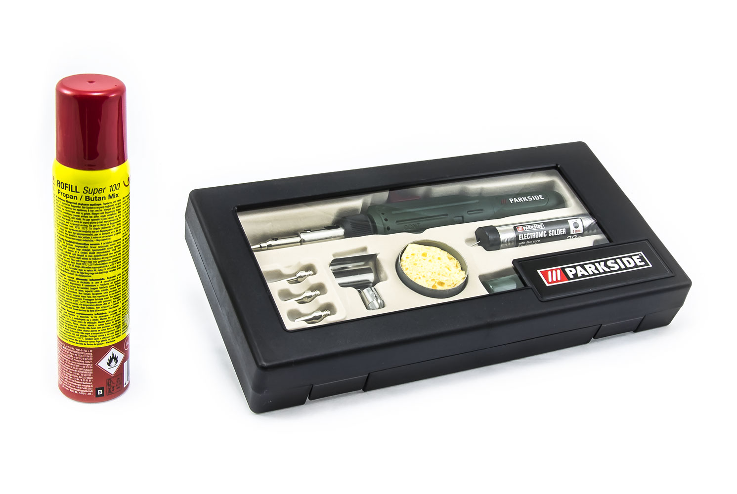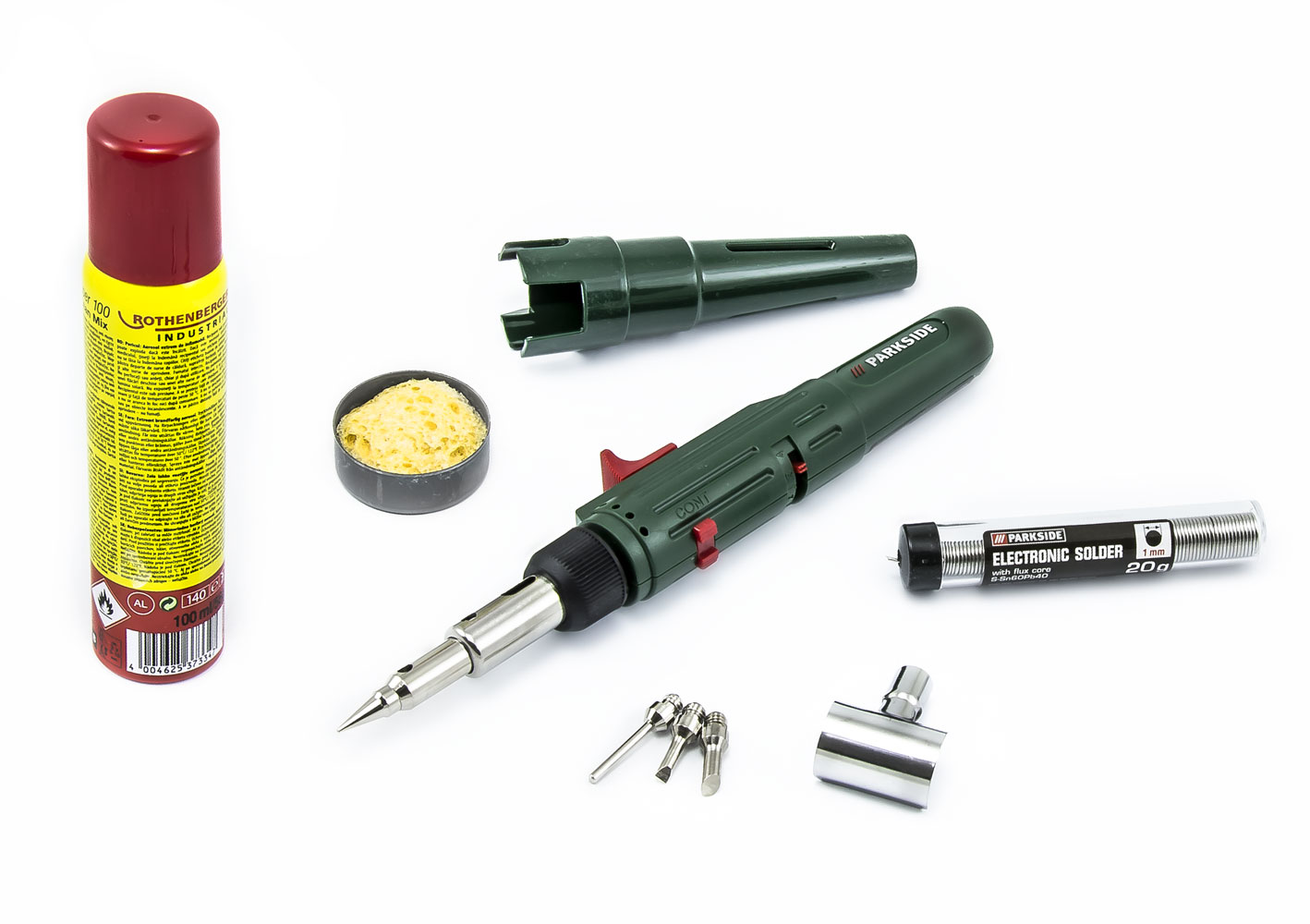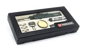 Ultraportabler kabelloser Lötkolben Parkside PLKA 4 B3 mit LED-Licht, 1500mAh Lithium-Ionen-Akku und ergonomischer Form mit gummiertem Gehäuse.