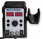 Die Heißlufttemperatur wird über Tasten gesteuert und der aktuelle Wert wird auf dem LED-Display angezeigt. Wenn die Temperatur mit den Tasten gewählt wird, zeigt das Display die eingestellte Temperatur an. Die Leistung des Turboladers wird über ein Potentiometer eingestellt. Natürlich gibt es einen Übergang in den Schlafmodus, wenn der Griff zum Ständer entfernt wird. Wenn der Griff wieder in die Hand genommen wird, wird innerhalb weniger Sekunden die normale Temperatur für das Löten entsprechend dem eingestellten Wert erreicht. Das gesamte Chassis ist aus Kunststoff gefertigt, was zum geringen Gewicht der Station beiträgt. Das Handstück ist leicht, obwohl eine Propellereinheit integriert ist; es wiegt etwa 180 g.