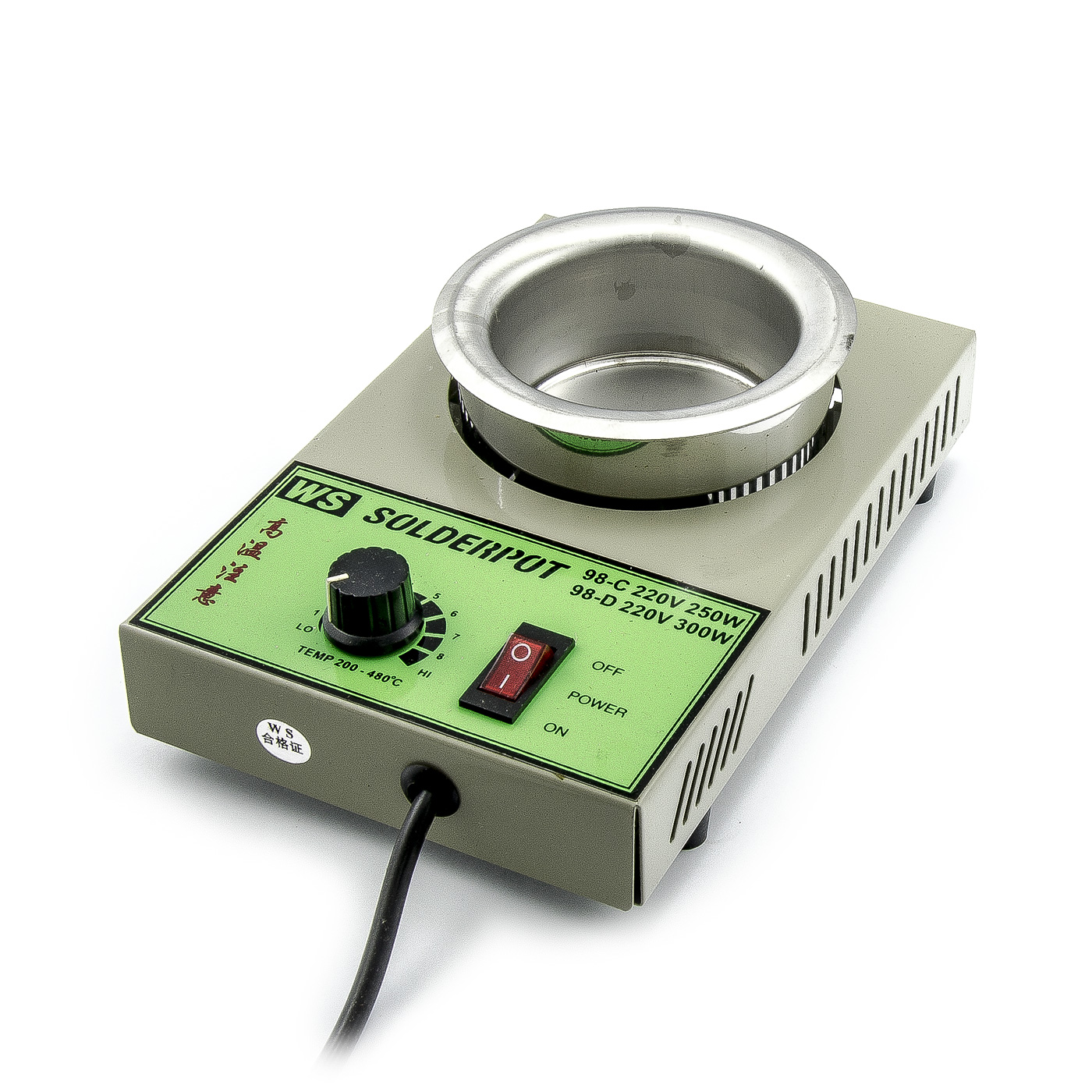 Verzinnungsbad zum Schmelzen von 800g Lotlegierung. Das Edelstahlbad mit einem Durchmesser von 80 mm wird durch eine Heizschlange mit einer Leistung von 250 W elektrisch beheizt. Die Oberfläche des Bades ist resistent gegen Oberflächenerosion in die geschmolzene Zinnmischung und beeinträchtigt neben ihrer langen Lebensdauer nicht die Eigenschaften der Lötlegierung; das Bad kann auch mit einer bleifreien Charge verwendet werden, aber die Lebensdauer ist dann geringer und es muss darauf geachtet werden, die strukturelle Integrität des Körpers nach längerem Gebrauch zu überprüfen.