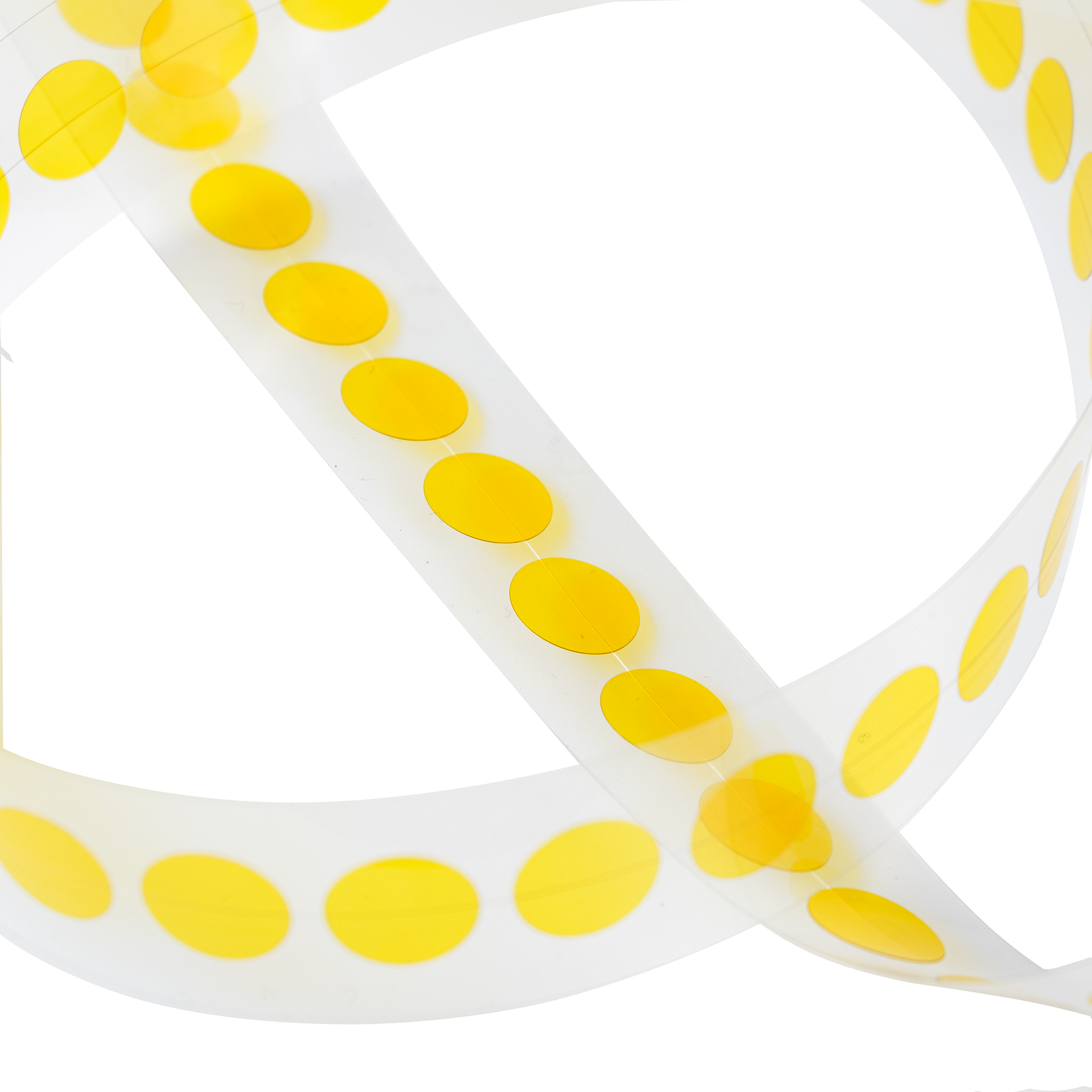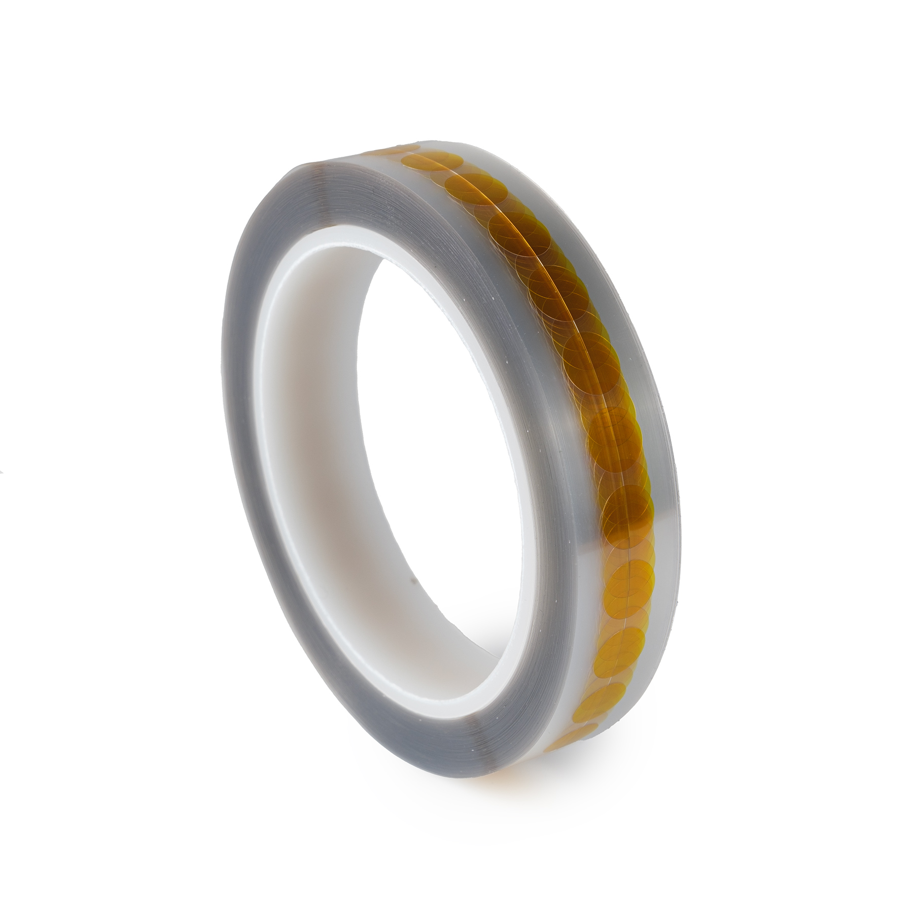 ESD-sichere, selbstklebende Kapton-Räder mit einem Durchmesser von 10 mm sind aus hochfestem Polyimidband gestanzt und werden auf einem handlichen Trägerband in Rollen zu 2000 Stück geliefert. Die präzise Form ermöglicht fortsetzung des Textes