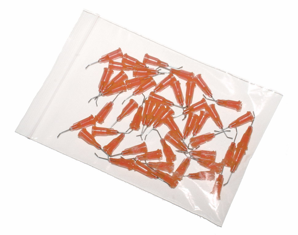 Dosierapplikationsnadeln mit einer stumpfen Kanüle im 45°-Winkel für die Applikation von Materialien an schwer zugänglichen Stellen. Die Kanüle jeder Nadel besteht aus rostfreiem Stahl und ist mit Klebstoff in einem Nylonhals mit Gewindeverschluss zum Aufschrauben auf die Kartusche befestigt. Jede der Nadeln ist mit einem Verschlusssystem mit Gewinde ausgestattet, das eine zuverlässige und schnelle Befestigung an einer Kartusche, Spritze oder einem Handdispenser ermöglicht.