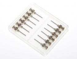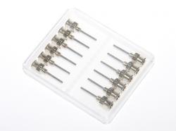 Stumpfe Ganzmetall-Applikationsnadeln mit einer Kanülenlänge von 25,4 mm (1") für die exakte Dosierung von mittel- bis sehr zähflüssigen Flüssigkeiten. Ideale Dosierspitze für Roboteranwendungen mit einem Druck von bis zu 6,8 bar. Der Körper und die Nabe der Nadel sind aus rostfreiem Stahl gefertigt und mit einer Kapillare aus rostfreiem Edelstahl versehen. Bei der Herstellung wird Wert auf die Oberflächenqualität und die genaue Einhaltung der Innendurchmesser der Nadel gelegt, weshalb die Oberfläche der Kapillare elektropoliert wird.