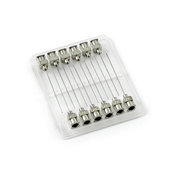 Stumpfe Ganzmetall-Applikationsnadeln mit einer Kanülenlänge von 38,1 mm (1,5") für die genaue Dosierung von mittel- bis sehr zähflüssigen Flüssigkeiten. Ideale Dosierspitze für Roboteranwendungen mit einem Druck von bis zu 6,8 bar. Der Nadelkörper und die Nabe sind aus rostfreiem Stahl gefertigt und mit einer Kapillare aus rostfreiem Edelstahl versehen. Bei der Herstellung wird Wert auf die Oberflächenqualität und die genaue Einhaltung der Innendurchmesser der Nadel gelegt, weshalb die Oberfläche der Kapillare elektropoliert wird.