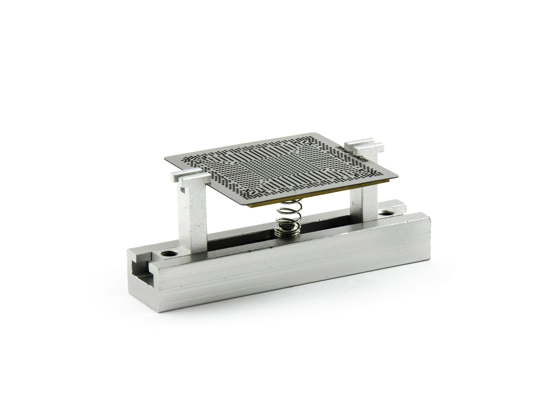 Aluminiumhalter für minimalistische BGA-Schablonen zum Reflowing von BGA-Chips. Es handelt sich um eine Aluminiumschiene, in der sich zwei bewegliche Griffe befinden, die mit einer versenkten Inbusschraube arretiert werden. Zusammen bilden sie die Backen des Schraubstocks, die die BGA-Chipschablone - bis zu 50 mm - halten. Der BGA-Chip selbst wird unter die Schablone gelegt, wo er von einer mitlaufenden Feder gehalten wird, die gegen die Reballing-Schablone gedrückt wird. Danach müssen nur noch die Zinnkugeln für das Reballing mit dem entsprechenden Durchmesser eingelegt und mit Heißluft erhitzt werden. Ausgelegt für Schablonen mit einer maximalen Größe von