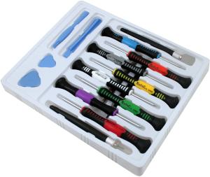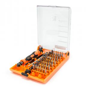 Handlicher Universalschraubendreher-Satz mit 42 Bits in verschiedenen Formen und Größen, darunter spezielle Sicherheitsbits wie Torx mit Loch in der Mitte, Tri-Wing-, Dreikant-, U-förmige und fünfzackige Stern-Bits. Natürlich sind auch Inbus- und TORX-Bits in verschiedenen Größen erhältlich. Der Satz enthält auch Steckschlüsseleinsätze zum Abschrauben kleinerer metrischer Muttern. Der Schraubendreher wird außerdem mit einem Bitverlängerer für schwer zugängliche Stellen geliefert, und das Set enthält auch eine Pinzette mit einer gebogenen scharfen Spitze. Der Schraubendreher selbst hat einen ergonomischen, gummierten Griff mit einer Ratschenspitze für schnelles Schrauben. Das ganze Set wird in einer praktischen Kunststoffbox mit Druckknopföffnung geliefert. Im geöffneten Zustand gleiten alle Bits vertikal heraus und können so leicht entnommen werden; im geschlossenen Zustand besteht keine Gefahr, dass sie herausfallen.